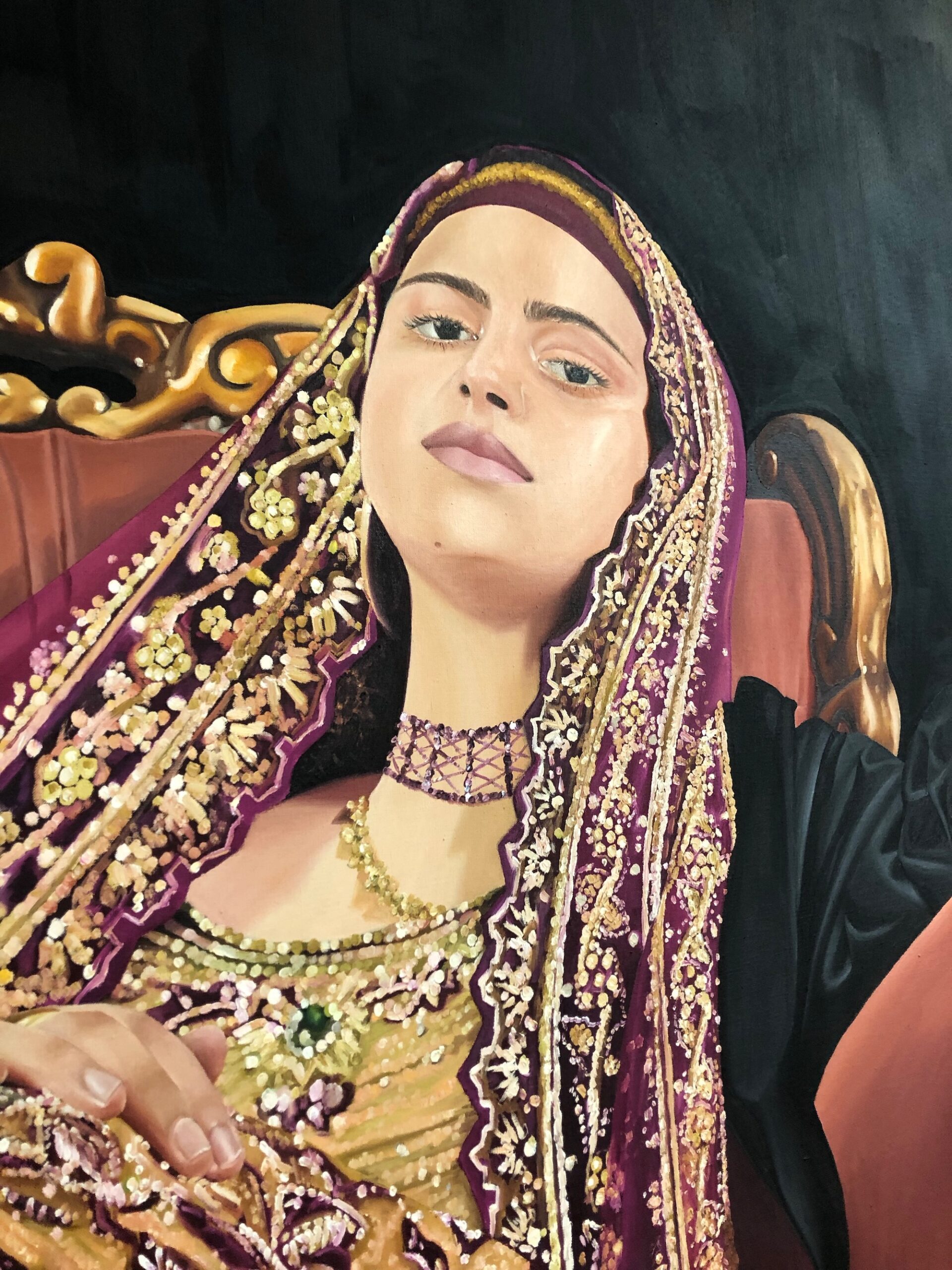 Exploring her identity as a young British Asian Muslim women within a contemporary Western space Azraa creates large scale oil paintings seeking to appropriate the image of Eastern Women as depicted from orientalist paintings from the 18th and 19th century.